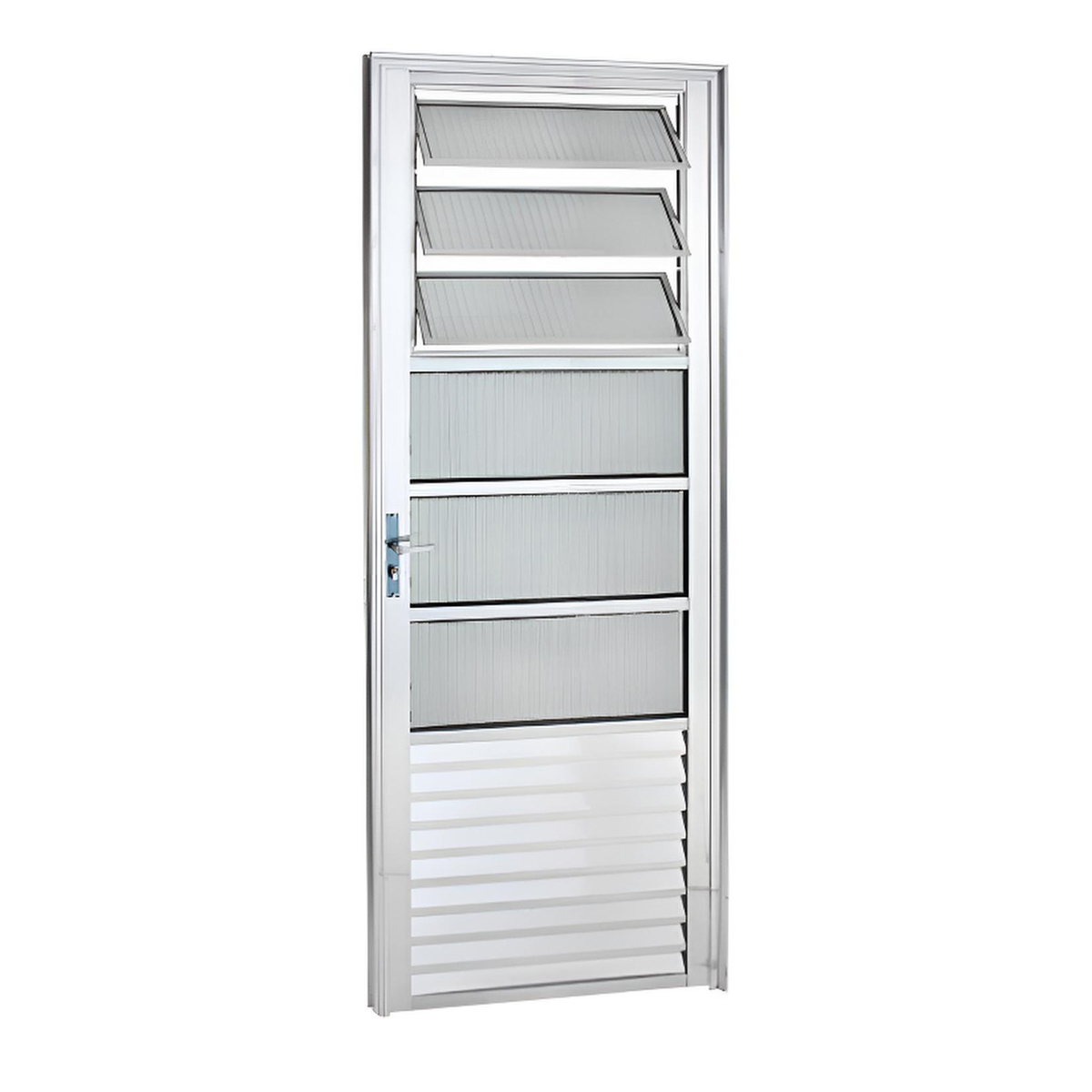 Porta de serviço que oferece o benefício da ventilação controlada através do seu sistema basculante com vidro canelado, garantindo luminosidade e privacidade.